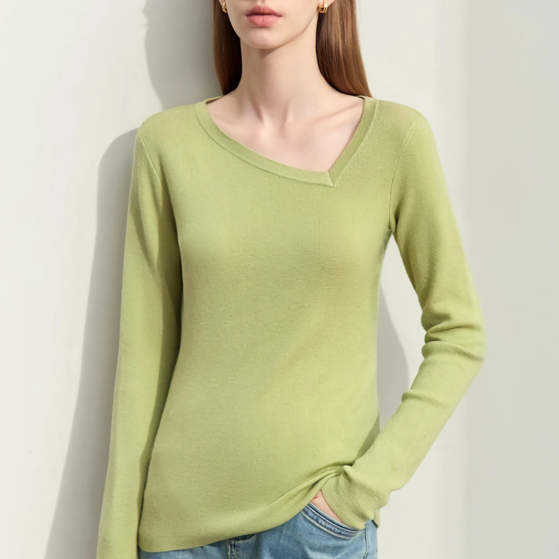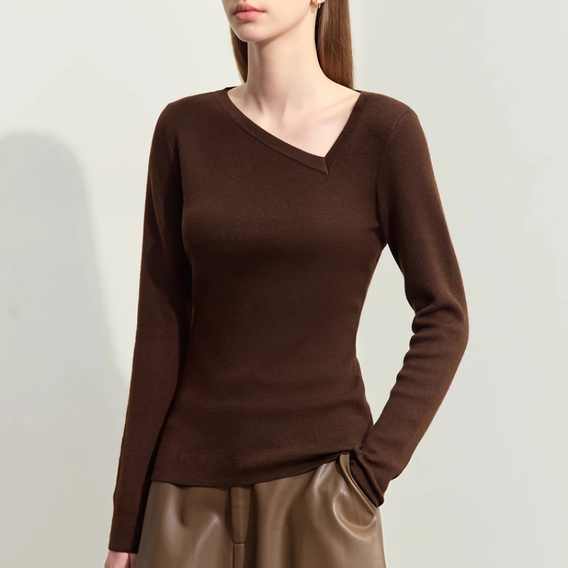 This sweater isn’t just about looks—it’s about feeling good, too. The slight stretch allows for comfortable movement, while the slim fit flatters your figure. The asymmetrical diagonal V-neck adds a touch of modernity and sophistication, setting it apart from your usual fall wardrobe staples.