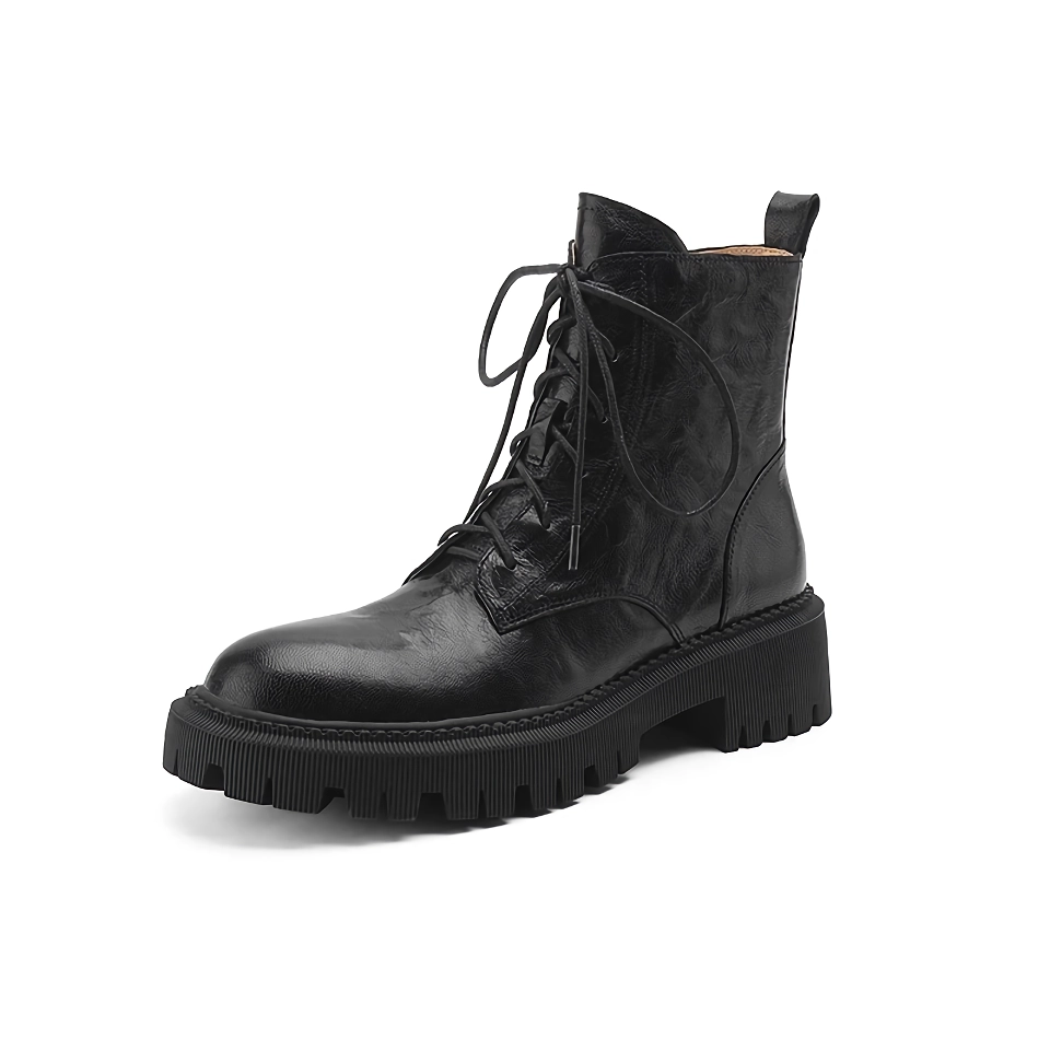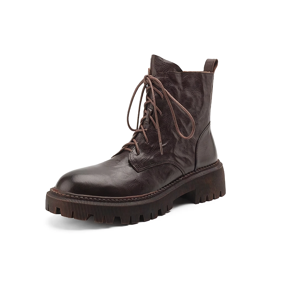 Crafted from genuine sheepskin leather, these Martin boots are not only durable but also exude a sophisticated, retro charm. The boots feature a round toe design and a practical 4.5cm square heel, offering both style and stability. The lace-up front paired with a convenient side zipper ensures a secure fit while adding a fashionable touch.