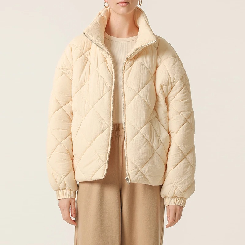 The elegant diamond-quilted pattern, paired with a turn-down collar and a full zipper closure, ensures you stay on-trend without compromising on comfort. The padded interior provides just the right amount of insulation to keep you warm, while the loose fit gives you freedom of movement, making this jacket perfect for day-to-day wear or casual outings. With a standard thickness, this jacket is ideal for layering over your favorite sweaters and tops as the weather cools down.